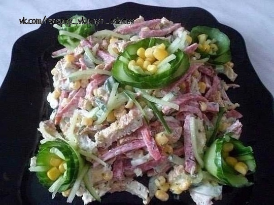 Огурцы и колбасу нарезать соломкой. Яйца отварить, охладить и нарезать соломкой, добавить в салат. Ввести горошек и тертый сыр. Заправить майонезом. Перемешать. Выложить на блюдо и подать к столу.