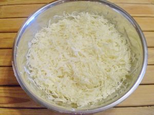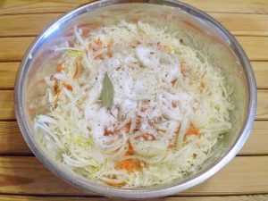 Мелко нашинкуйте капусту. Лук нарежьте очень мелко, а морковь натрите на крупной терке. В глубокой миске соедините капусту, морковь, лук, соль, сахар и специи.