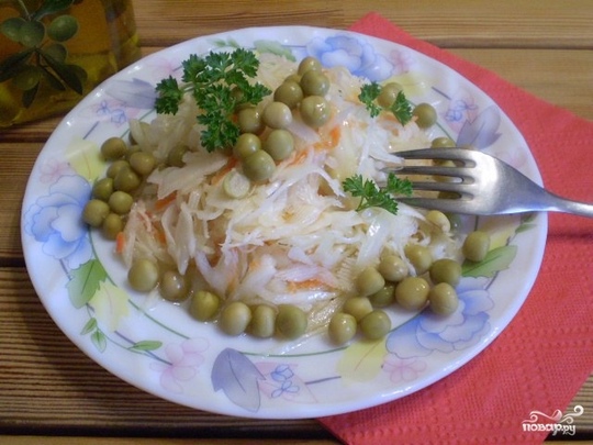 Капуста готова! Добавьте в готовый салат консервированный горошек. Приятного аппетита!