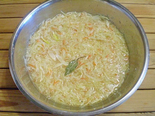 Довести литр воды до кипения. Залейте уксусом, растительным маслом и кипятком капусту, тщательно утрамбуйте деревянной ложкой. Затем накройте крышкой и оставьте до полного охлаждения.