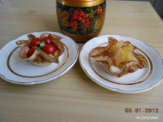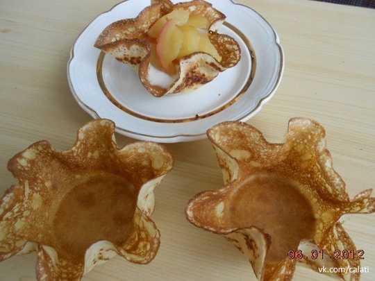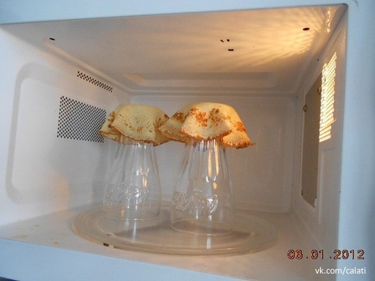 Теперь начинается самое интересное — формируем корзинки. Для этого переверните обычный стакан, уложите на него блинчик и поставьте в микроволновку на 20-30 секунд, в зависимости от мощности вашей печи. Вот и весь секрет.