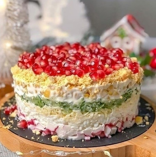 Составляйте слои: нарезанные соломкой крабовые палочки, затем белки, тертый сыр и отжатые натертые огурцы. Далее добавьте кукурузу и желтки, каждый слой смазывайте майонезом, а слой с огурцами слегка посолите👌. Наверху посыпьте зёрнами граната.