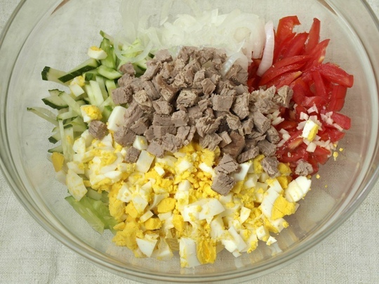 Помидоры и огурцы нарежьте тонкой соломкой и положите в глубокую чашу, туда же добавьте лук и измельчённый чеснок. Перемешайте с мясом и яйцами.