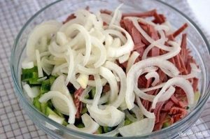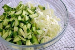 Капусту нарезаем (мы используем пекинскую для большей вкусноты). Огурец нарезаем соломкой (предпочитаю более крупные кусочки). Колбасу также нарезаем соломкой, а лук — полукольцами. Все компоненты смешиваем с майонезом, добавляем соль и перец, и тщательно перемешиваем!