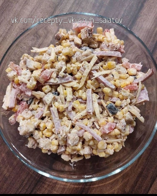 Ветчину нарезаем соломкой (или кубиками, как больше нравится), помидор и оливки также нарезаем кубиками. Сухарики обжариваем на оливковом масле с добавлением чеснока, сыр трём на крупной тёрке. Все ингредиенты смешиваем и заправляем майонезом или сметаной, можно в равных пропорциях 🤗