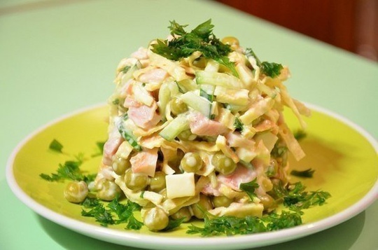 4. Добавить консервированный горошек. Посолить, заправить майонезом, посыпать зеленью.