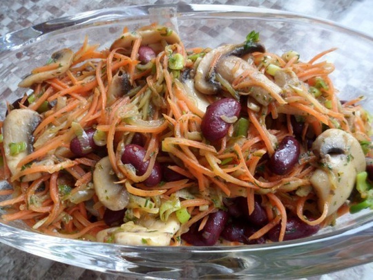 Свежие шампиньоны нарезать соломкой по длине шляпок и обжарить на растительном масле до готовности. Лук нарезать полукольцами и тоже обжарить. Морковь натереть на крупной терке и обжарить отдельно. Огурцы нарезать соломкой, фасоль перед этим промыть.