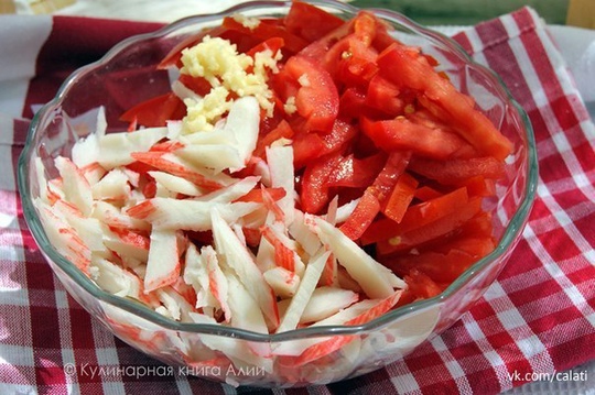 Для его создания вам понадобятся крабовые палочки, нарезанные по диагонали, помидоры с удаленной серединкой, порезанные тонкой соломкой, и мелко нарезанный чеснок.
