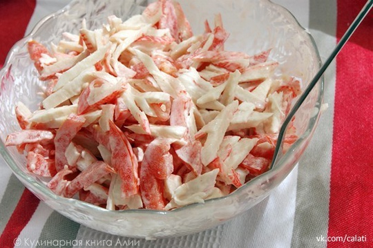 П.С. Автор не указал точное количество ингредиентов, но я использовала пачку крабовых палочек, 2 помидора и 2 зубца чеснока. Майонез добавьте по вкусу. Результат удивительно вкусный!