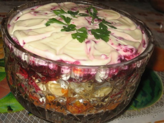 Это один из самых распространенных и вкусных слоеных салатов, обладающий тремя уникальными вкусами. Его можно встретить под различными именами, но мне больше нравится название — Лакомка.