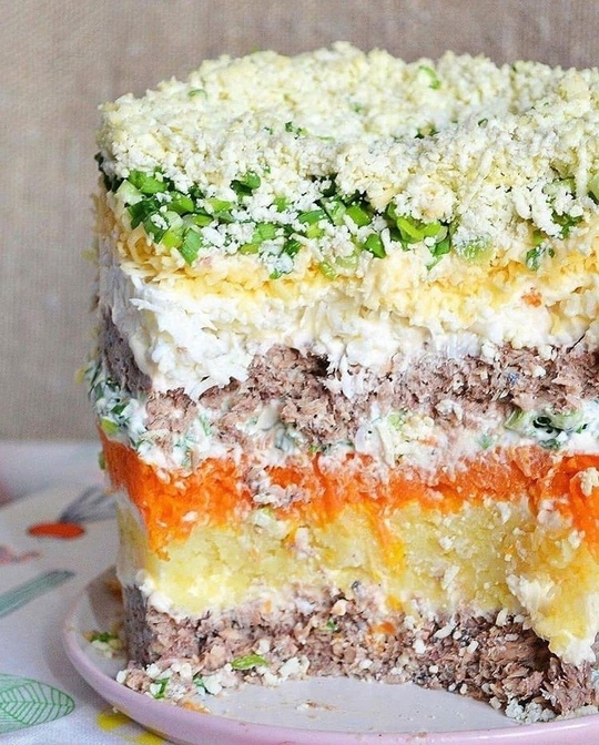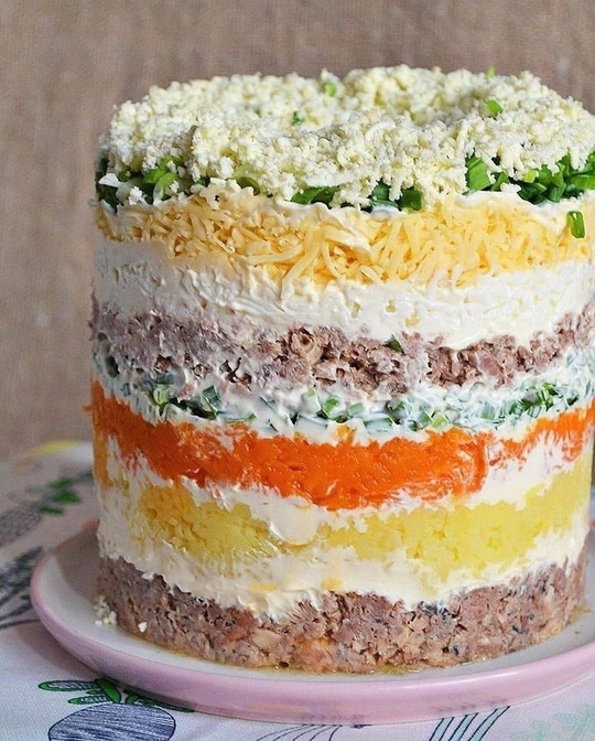 Смешивается 180 г сайры, 40 г майонеза, 300 г картофеля, 40 г майонеза, 250 г моркови, 40 г майонеза, 40 г зеленого лука, 30 г майонеза, 180 г сайры, 40 г майонеза, 150 г белка, 40 г майонеза, 100 г сыра, 40 г майонеза, 35 г зеленого лука и 70 г желтка. Не следует пугаться обилию майонеза — он создает очень тонкий слой между основными компонентами. Салат можно формировать как в кольце, так и просто на сервировочном блюде.