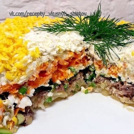 2. Слои выкладываем в салат. Можно использовать кулинарное кольцо или просто укладывать слои: