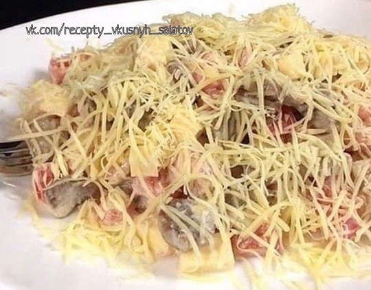 8. Подаем готовый салат на блюде, сверху посыпаем натертым сыром. Приятного аппетита!