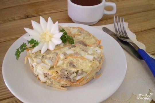 Для приготовления салата отварите яйца и куриную печень. Все нарежьте мелко, а сыр натрите. Смешайте продукты, добавьте майонез для заправки. Салат готов!