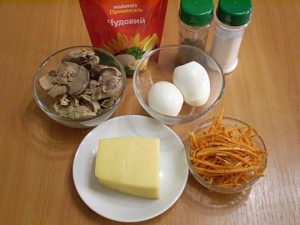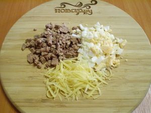 Печень и яйца нарежьте маленькими кубиками, сыр натрите на крупной терке.