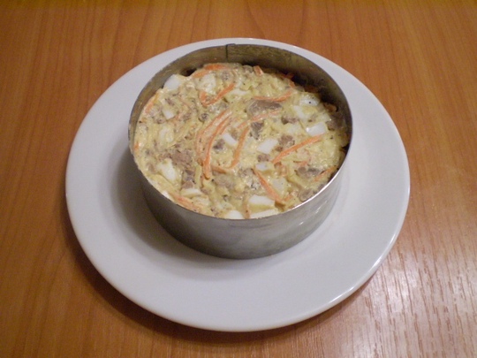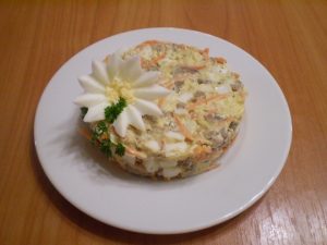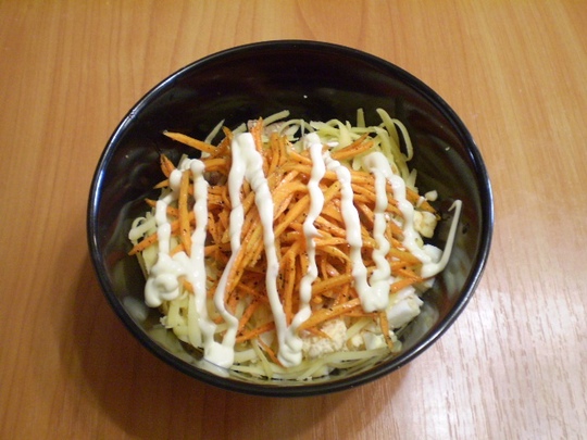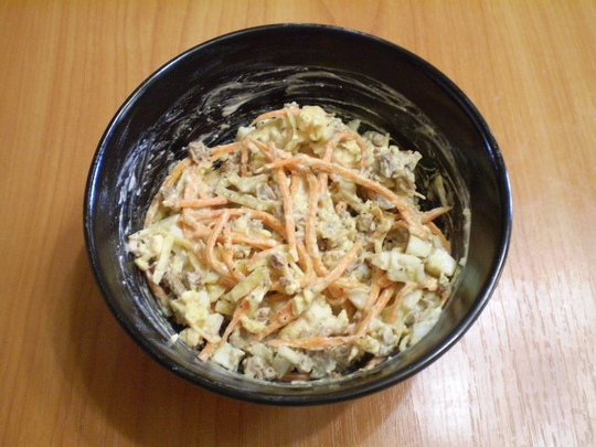 Смешайте все продукты и добавьте майонез для заправки.