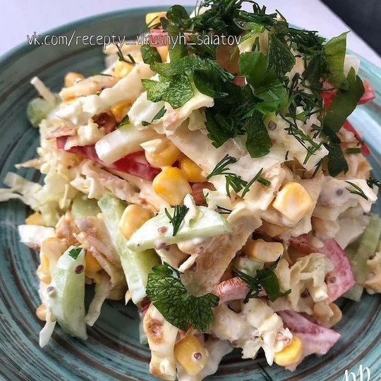 Взбиваем яйца, добавляем соль и жарим блинчик. Режем ветчину. Нарезаем овощи и блинчик соломкой, добавляем кукурузу, заправляем сметаной и горчицей (по желанию можно посолить и приправить перцем). Салат готов 😊