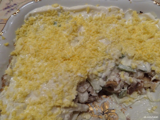 Куриное филе, огурцы и лук нарезать маленькими кубиками. Слить жидкость из шампиньонов и, если нужно, нарезать их. Натираем сыр на мелкой терке. Из яиц извлечь желтки, а белки нарезаем соломкой. Строим слои в посуде для салата: белки, куриное филе, лук, огурцы, грибы и сыр, при желании добавляя майонез. Сверху обмазываем майонезом и посыпаем тертыми желтками.