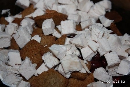 3. Куриную грудку нарезаем кубиками и добавляем в общую смесь.
