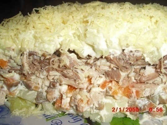 Все составные части нарезать маленькими кубиками. Укладывать слоями в соответствии с рецептом. Каждый слой аккуратно смазывать майонезом.
