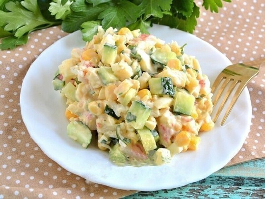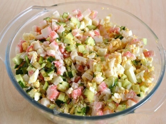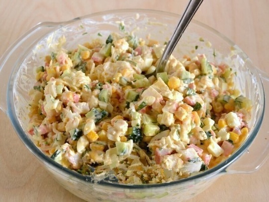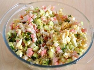 Все элементы должны быть тщательно охлаждены перед приготовлением. В качестве заправки я использовала легкий майонез.