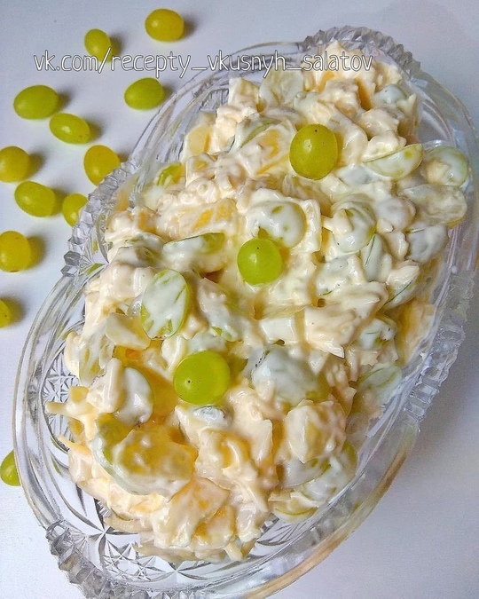 Виноград нужно промыть и разрезать каждую ягоду пополам. Ананасы нарезаем небольшими кубиками. Сыр натираем на терке. Чеснок пропускаем через пресс. Салат заправляем майонезом.
