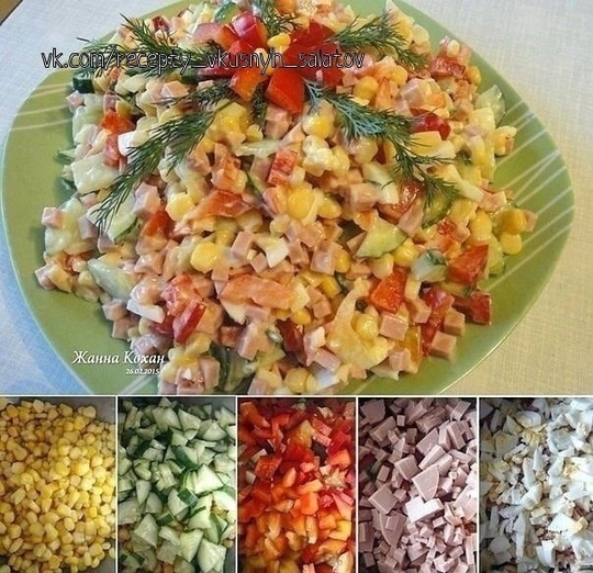 1. Очистить яйца и нарезать их мелкими кусочками. Перец, огурцы и ветчину нарезаем кубиками. Слить жидкость из консервированной кукурузы.