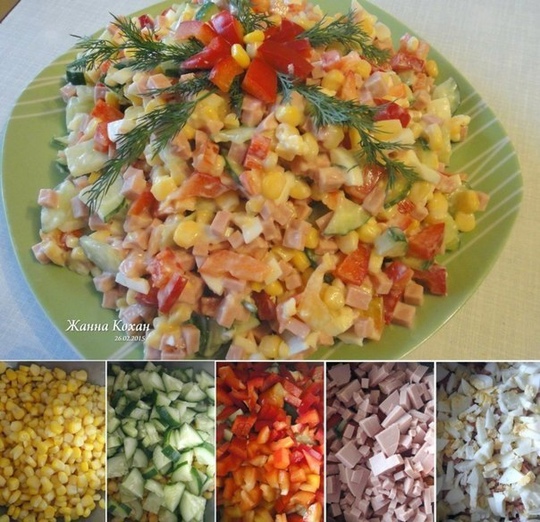 2. В миске объедините яйца, перец, огурцы, ветчину и кукурузу, тщательно перемешайте.