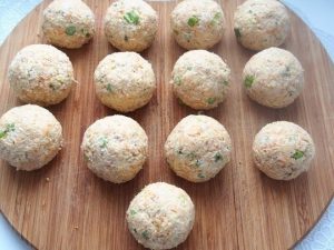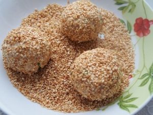 Добавьте к рыбе натертый на крупной терке картофель и морковь, натертую на мелкой терке, все хорошо перемешайте. Затем добавьте натертые на мелкой терке сыр и яйца. Перемешайте массу еще раз. Зеленый лук промойте и измельчите, добавьте в смесь. Влейте соевый соус и добавьте сметану, тщательно все перемешайте до однородной массы. Сформируйте из нее шарики немного больше грецкого ореха. Обжарьте кунжут на сухой сковороде до золотистого оттенка. Обваляйте шарики в кунжуте. Разложите готовые шарики на блюде и при желании украсьте. Они получаются невероятно вкусными и нежными.