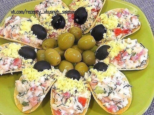 Приступаем к процессу: — Мелко порежьте помидоры, если они слишком сочные — слейте лишний сок. — Мелко нарежьте зелень. — Сыр натрите на мелкой терке. — Объедините сыр, помидоры и зелень. — Введите выдавленный чеснок. — Добавьте майонез и тщательно перемешайте. — Получившуюся массу распределите по чипсам. — Украсьте маслинами.