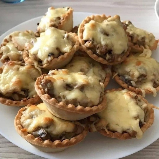 Обжариваем лук до золотистости, затем добавляем нарезанные грибы и готовим до мягкости. Отвариваем куриную грудку и нарезаем кубиками. Соединяем грибы с курицей, добавляем соль, муку и сливки. Размещаем массу в тарталетках, сверху посыпаем натертым сыром. Помещаем в заранее разогретую духовку (до 200 градусов) до золотистой корочки сыра.
