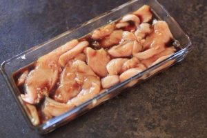1. Нарежьте куриное филе на полоски, залейте маринадом и дайте настояться 20 минут.
