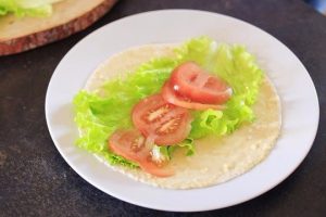 6. Нанесите соус на теплую лепешку, добавьте листья салата и кольца помидоров.